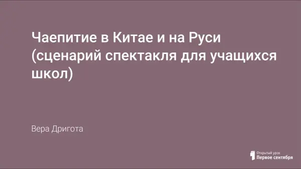 Сценарий делится на 2 части: «Китайское чаепитие» и «Чай на Руси». В сценарии освещаются интересные факты истории чая: когда появился чай впервые, как выглядит чайное растение, сколько лет пьют чай на Руси и т.д.