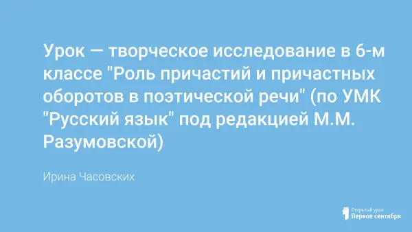 Урок в 6-м классе "Роль причастных оборотов в поэтической речи" - это анализ стихотворения Виктора Краско о русском языке, который в понимании поэта является чудом великим. Все в уроке: определение идейно-тематического содержания стиха, восприятие образно-эстетических особенностей текста, нахождение языковых средств, лингвистический эксперимент, ответы на проблемные вопросы, ассоциативное восприятие слова и грамматических понятий, цветового и смыслового значения звуков в слове - направлено на совершенствование языкового чутья, речевой деятельности, на воспитание чувства уважения к родному языку.