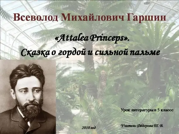 В сказке-аллегории "Attalea princeps" о пальме, рвущейся к солнцу сквозь крышу оранжереи и погибающей под холодным небом, В.М. Гаршин символизировал красоту борьбы за свободу, хотя и борьбы обреченной. Урок посвящён анализу литературной сказки В.М. Гаршина "Attalea princeps". Цель урока – развивать навыки анализа художественного текста, внимательного отношения к слову. Дети должны увидеть, что для понимания произведения им нужно обращать внимание на многие детали текста.