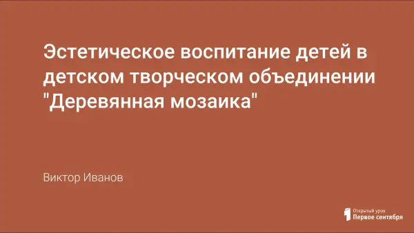 В основу программы "Деревянная мозаика" заложена идея приоритетности эстетического воспитания детей через приобщение их к традиционной народной культуре. На занятиях создаются условия для обогащения внутреннего мира детей, формирования их духовных и нравственных качеств. В систему воспитательных дел в объединении "Деревянная мозаика" организованно вплетаются средства, стимулирующие эстетические чувства. В этом важнейшую роль выполняет интерьер кабинета для занятий. Рабочий кабинет - это дом, в котором ребята проводят часть своего времени.
