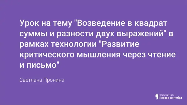 Стадии урока: вызов, осмысление, рефлексия. На уроке рассматриваются формулы сокращенного умножения. В течение урока учащиеся имеют возможность предполагать, подтверждать или опровергать свои предположения; знания добываются самостоятельно; учащиеся работают в группах; обмениваются информацией; при этом развивается память и речь.