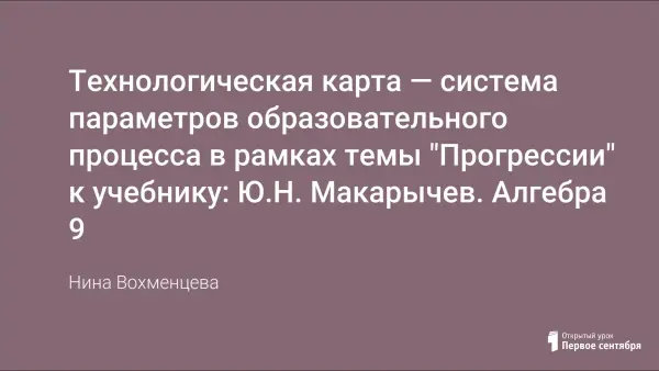 В статье "Технологическая карта - система параметров образовательного процесса в рамках темы "Прогрессии" представлена технологическая карта к учебнику Ю.Н.Макарычев "Алгебра 9", и презентация, в которой отражены требования к составлению технологических карт.
