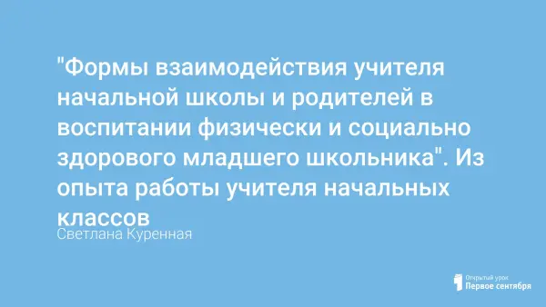 Взаимодействие семьи и школы, более тесное сотрудничество родителей и учителя, по-прежнему играет очень важную роль в процессе обучения, воспитания и развития школьников. В статье делюсь опытом организации мероприятий, направленных на взаимодействие семьи и школы. Это взаимодействие даёт возможность осознать родителям необходимость приобретения новых знаний для формирования и развития здоровой и полноценной личности, а также формирует потребность у семьи в непосредственном общении с педагогами и иными специалистами школы, которые помогают вырастить физически и социально здорового младшего школьника.