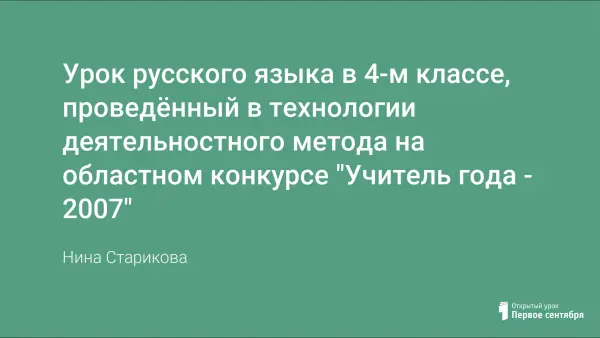 Предлагаю тематический урок русского языка в 4-м классе. Это урок общеметодологической направленности, проведённый на областном конкурсе «Учитель года 2007» в технологии деятельностного метода. (Аналогичный урок, но по теме «Зима», проведён мною на городском конкурсе «Учитель года–2007».) Часто в своей практике я использую приём «совместимость несовместимого». На уроке закрепление изученного материала я совмещаю с «открытием» нового знания в «творческом» плане. Это делает урок интересным, незабываемым.