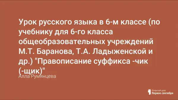 Урок русского языка в 6-м классе знакомит учащихся с суффиксом -чик (-щик) и правилом написания букв «ч» и «щ» в суффиксах. Ребята учатся узнавать суффиксы, правильно их писать, устно рассуждать и письменно объяснять условия выбора букв «ч» и «щ» в суффиксах. Урок объяснения нового материала провожу в форме урока-презентации. Эта форма способствует стимулированию положительной мотивации учащихся к теме, позволяет расширить кругозор ребят, способствует развитию речи учеников и обогащению их словарного запаса, развивает творческое воображение ребят, ассоциативный тип мышления, их фантазию, наблюдательность.