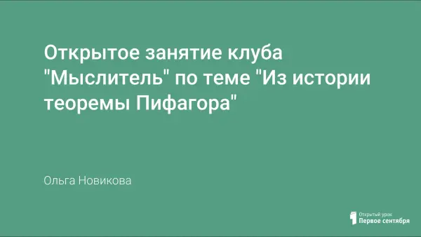 Занятие клуба по работе с одарёнными детьми «Мыслитель» с мультимедийным сопровождением «По следам Пифагора», являющееся приложением к данному уроку, а к нему более подробные пояснения или задачи. К этому же занятию дается приложение «Практическое применение теоремы Пифагора».