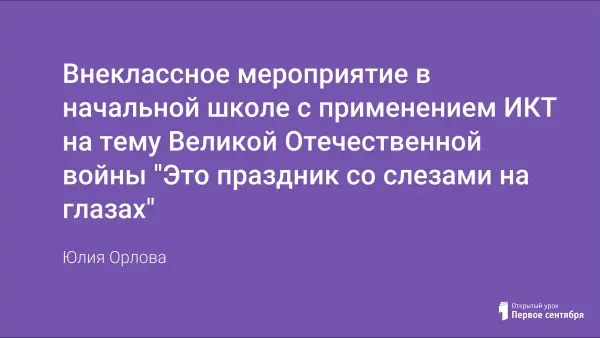 Строгие рамки урока и насыщенность программы не всегда позволяют ответить на многие интересующие детей вопросы. И тогда на помощь приходят внеклассные занятия. А если в них внедрить новые информационные технологии, то они в силу своей наглядности, красочности и простоты принесут наибольший эффект и будут иметь еще большее значение в развитии и воспитании детей. В качестве примера в работе рассматривается внеклассное мероприятие в начальной школе с применением ИКТ на тему Великой Отечественной войны "Это праздник со слезами на глазах".