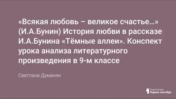 Цели урока: познакомить учащихся с особенностями бунинского восприятия любви; организовать групповую деятельность учащихся для ответа на проблемный вопрос урока; совершенствовать умение учащихся анализировать текст художественного произведения; развивать творческую речевую деятельность учащихся через выражение своего мнения в устной форме; воспитывать культуру общения и культуру чувств, интерес к творчеству И.А.Бунина.