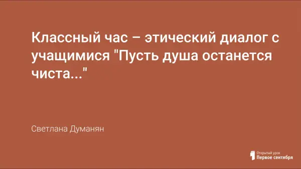 Одной из наиболее острых проблем, вызывающих тревогу в современном обществе, является проблема сохранения окружающего мира. Но, борясь за чистоту и спасение природы, люди часто забывают, что начинать нужно с себя, воспитывая в своей душе лучшие нравственные качества. Очевидно, что добрый, милосердный, думающий об общих интересах человек никогда сознательно не нанесёт вреда миру природы и людей. Этический диалог «Пусть душа останется чиста…» даёт возможность учителю вовлечь учащихся в разговор на актуальную тему и заставить их рассуждать, обдумывать свои поступки и соотносить их с моральными духовными принципами жизни в обществе.