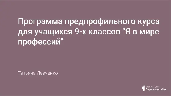 Нами представлена программа предпрофильного курса (пояснительная записка, тематическое планирование и список литературы) для учащихся 9-х классов "Я в мире профессий", которая призвана помочь школьникам в нелегкий переходный период. Учащийся, совершая первый профессиональный выбор, приобретает ценный личный опыт. В процессе участия в занятиях формируются необходимые знания, навыки и умения, связанные с преодолением трудностей.