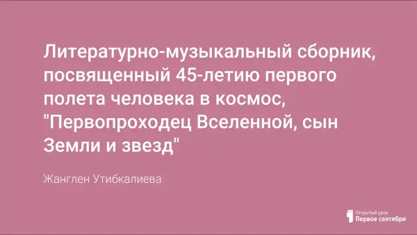 Литературно-музыкальный сборник, посвященный 45-летию первого полета человека в космос, проведенный в День космонавтики. Под музыкальное сопровождение участники физического кружка рассказывают о жизни первого космонавта Земли Ю.Гагарине, о первом полете человека в космос, о начале освоения космического пространства.