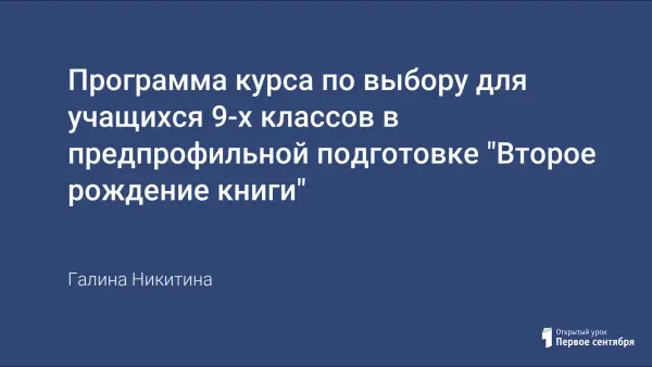 Курс должен способствовать воспитанию у ребят бережного отношения к книге. Он научит сохранять и омолаживать книги путем реставрации и переплетных работ. Курс рассчитан на 12 учебных часов. Его изучение будет способствовать ознакомлению с профессиями, связанными с книгоизданием.