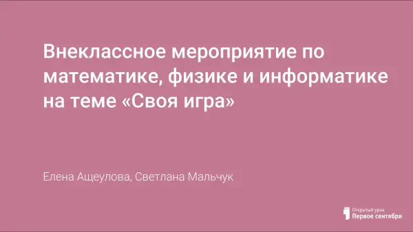 В основе мероприятия лежит телевизионная версия викторины "Своя игра", адаптированная к школьным условиям. Основная цель игры – развитие познавательного интереса учащихся. Мероприятие оформлено мультимедийной презентацией, с помощью которой удаётся вызвать живой интерес школьников к викторине.
