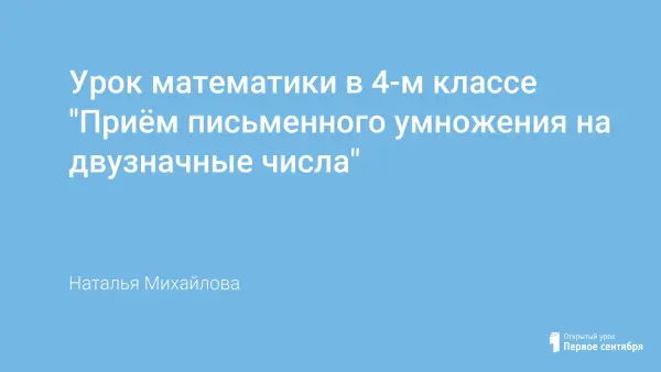 Цель предложенного урока — познакомить детей с приемом письменного умножения на двузначные числа. Чтобы развивать интерес к математике, я использовала игровые моменты, больше давала развивающих заданий. Учитывала уровень развития детей, поэтому работу на уроке дифференцировала. Также целью ставила закрепить умения решать задачи.