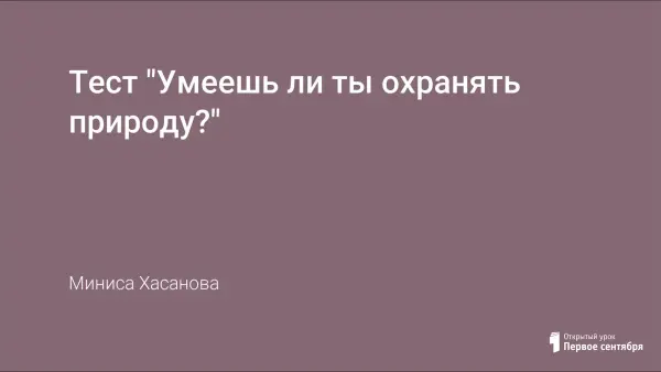 Цель настоящего теста: расширение и закрепление экологических знаний и реализация возможности применения их на практике; формирование у школьников убеждений и навыков, нравственных принципов и активной жизненной позиции в области охраны окружающей среды. Главная воспитательная задача: воспитание у школьников бережного, внимательного отношения к природе.