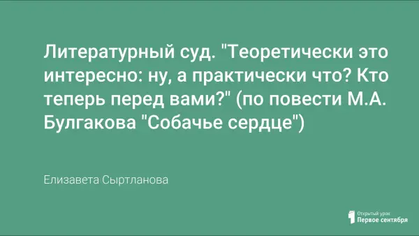 На сегодняшнем заседании "литературного суда" рассматривается дело Шарикова Полиграфа Полиграфовича. Дело состоит из трех томов. В деле представлены материалы прессы, средств массовой информации, а также вещественные доказательства (кусок колбасы "особенная краковская", рыба-семга, дневник доктора Борменталя, разбитая дверь туалета, лопнувшая труба, видеокассета к/ф "Собачье сердце" режиссера-постановщика Л.К. Зверева).