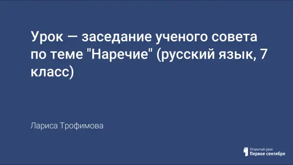 Урок-заседание ученого совета по теме "Наречие" проводится в 7-м классе. Целью урока является не только повторение и обобщение материала по теме, но и обучение учащихся рецензированию, умению работать в группах, а также развитие речи. Подобную нетрадиционную форму проведения урока можно использовать при повторении материала не только по теме "Наречие", но и по другой теме.