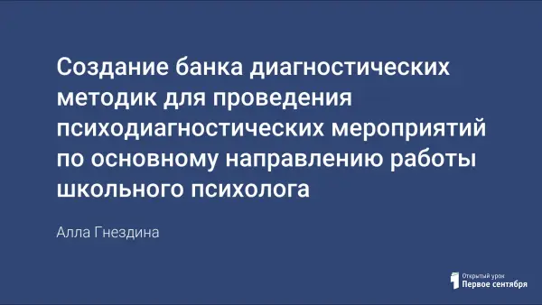 Работа по систематизации материала «Создание банка диагностических методик для проведения психодиагностических мероприятий по основному направлению работы школьного психолога» - кропотливая и занимает много времени. Систематизация диагностических методик по классам поможет педагогу-психологу планировать свою работу в разных направлениях своей деятельности со всеми участниками образовательного процесса.