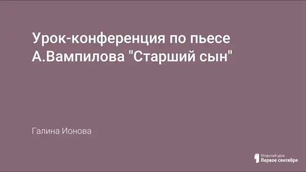 Открытый урок, посвященный жизни и творчеству Александра Валентиновича Вампилова, раскрывает духовный мир писателя, выявляет разносторонний круг его интересов, увлечений. Подробный анализ текста произведения «Старший сын» позволяет воспитывать у учеников важнейшие нравственные понятия: доброту, искренность, порядочность, благородство, чувство собственного достоинства.