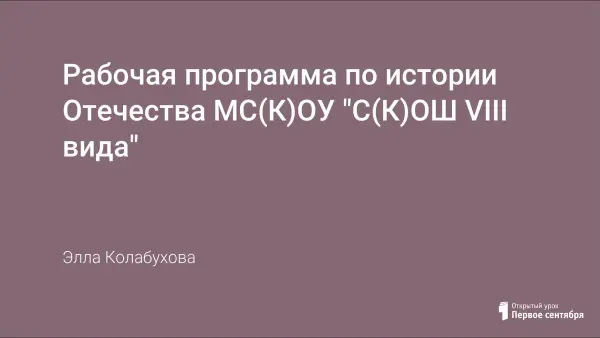 Рабочая программа по истории Отечества для 7-го класса специальной (коррекционной) школы VIII вида разработана с учётом требований государственного образовательного стандарта. В данной рабочей программе приведены примеры структурных компонентов, кроме календарно-тематического планирования.