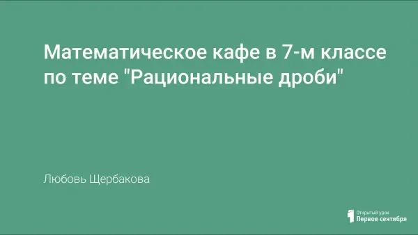 Предлагаемый урок для учащихся 7-х классов позволяет обобщить знания по теме "Рациональные дроби". В непринужденной форме, за столиками "кафе" учащиеся обобщают свои знания и закрепляют их при решении "вкусных" задач. Применение различных средств мультимедиа: графопроектор, компьютер со слайдами, интерактивная доска, очень помогает учащимся быстро закрепить материал, вызвает желание расширять свой кругозор.