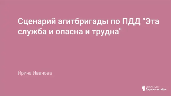 Сценарий агитбригады "Порядочек" "Эта служба и опасна и трудна" написан руководителем агитбригады, учителем музыки И.В.Ивановой Написание сценария - это небольшая половина работы руководителя агитбригады. Самое главное, - воплотить свой замысел на сцене, чтобы песни, танцы, сценки, декламирование стихов, костюмы, реквизит - всё это стало настоящим маленьким спектаклем, в котором ярким доступным языком давалась информация о работе ГИБДД, об обстановке в городе, а также страницы истории, цифры, факты, события.