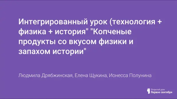 Урок позволяет рассмотреть процесс копчения с точки зрения технологии приготовления продуктов, используемых физических процессов (диффузия, конденсация, строение вещества, адсорбция), вспомнить историю возникновения копчения, систематизировать знания учащихся об основных занятиях наших предков.