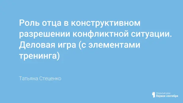 Отцовское влияние – это огромная и благородная сила в воспитании детей. Беда сегодняшнего дня, что эта сила часто не ощущается. Данная работа по формированию социального партнерства школьного психолога и семьи представлена в форме ролевой игры с элементами тренинговых упражнений. Использование таких приемов на занятии, как раскрытие понятия «конфликт» с помощью эксперимента с бумагой, использование притчи, музыкотерапии, знание формулы законов семьи, повышает эффективность психопрофилактической работы, развивает личность самих родителей.