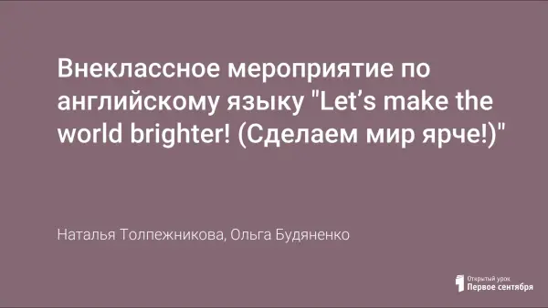 Внеклассное мероприятие по английскому языку «Сделаем мир ярче! - Let’s make the world brighter!» направлено на изучение иностранного языка через формирование толерантной личности, знающей культуру и обычаи других народов и своей страны. В мероприятии задействованы фонетические, грамматические и лексические материалы. Данное мероприятие предназначено для учащихся 5–8-х классов.
