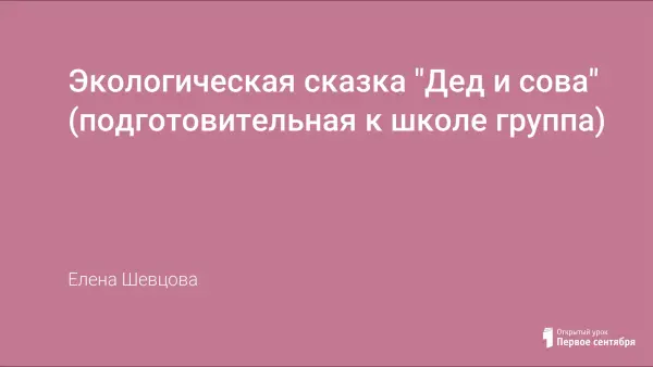 Экологическая сказка, составленная по мотивам сказки В.Бианки «Сова», воспитывает в детях посредством художественного слова любовь к природе, помогает детям почувствовать, «вжившись» в роль живого существа, что мир наполнен существами радующимися и страдающими, требующими бережного и уважительного отношения.