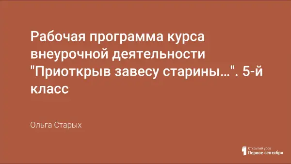 Как жили наши предки? Как одевались? Что ели? Как работали и отдыхали? Какие песни пели? Какие сказки рассказывали? Программу курса внеурочной деятельности «Приоткрыв завесу старины» можно рассматривать как системообразующий элемент изучения самобытной национальной культуры для школьников младшего подросткового возраста, что способствует достижению важнейшей цели современного образования – воспитанию нравственного, ответственного, инициативного и компетентного гражданина России.