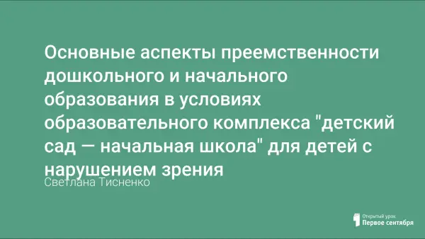 Новые реалии ставят перед педагогами – воспитателями и учителями задачу развития ребенка как непрерывный процесс. Однако вопрос преемственности дошкольного и школьного образования в работе с детьми, имеющими сенсорные отклонения, недостаточно широко представлен в педагогической прессе. В данной статье показаны пути решения проблемы преемственности дошкольной и начальной ступеней образования на примере образовательного комплекса "детский сад - начальная школа" для детей с нарушением зрения.