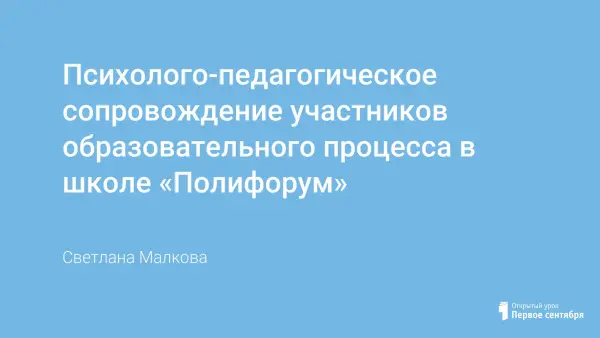 Статья раскрывает особенности психолого-педагогического сопровождения образовательного процесса в школе «Полифорум» по направлениям: мониторинг личностного развития учащихся и становления коллективов, психолого-педагогическая поддержка всех участников ОП, сопровождение учащихся в периоды адаптации и учащихся с трудностями в обучении. Методы работы: психолого-педагогические консилиумы, диагностика, коррекция, просвещение и консультирование.