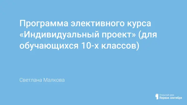 Программа элективного курса «Индивидуальный проект» для обучающихся 10-х классов составлена на основании требований ФГОС СОО, программа даёт возможность реализовать актуальные в настоящее время компетентностный, личностно ориентированный, деятельностный подходы. Нацелена на формирование у обучающихся необходимых универсальных учебных действий для осуществления проектно-исследовательской деятельности в различных областях знаний под руководством учителей-предметников, освоение обучающимися компетенций – когнитивной, информационной, коммуникативной. Обеспечивает теоретическую подготовку обучающихся по вопросам проектно-исследовательской деятельности, позволяет создать условия для развития интеллектуальных, творческих и коммуникативных способностей обучающихся, их самоопределения и самореализации. Принципы отбора основного и дополнительного содержания связаны с возрастными особенностями развития обучающихся.