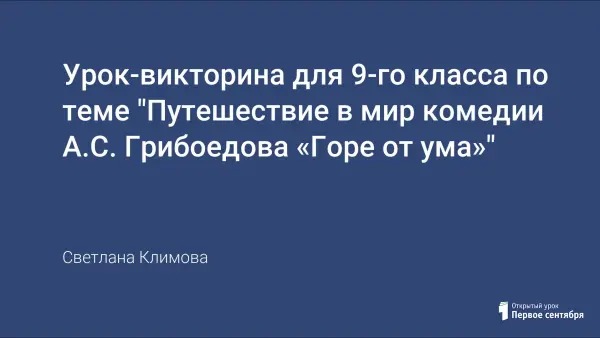 Урок-викторина может быть проведен как обобщающий после изучения комедии в рамках программы, а может быть использован в качестве внеклассного мероприятия при проведении предметной недели. В викторине принимают участие две команды и зрители-болельщики, при необходимости помогающие ответить на вопрос своей команде.