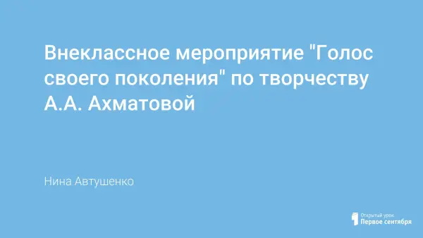 Внеклассное мероприятие проходит в форме поэтического вечера. Учащиеся входят в зал под музыку Шопена (Вальс "До диез минор"). Необходима серьёзная подготовка с детьми, так как весь вечер проводят они, под чутким руководством педагога. Дети заранее готовят чтение стихов Ахматовой наизусть под музыку. Приведённый материал необходимо заранее распределить по учащимся. Педагог должен знать, кто сидит, за каким столиком (участники). Выбор стихов - дело чисто индивидуальное. Весь вечер сопровождается показом слайдов.