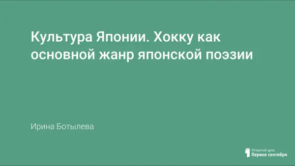 Японская поэзия основана на чередовании определенного количества слогов. Рифмы нет, но большое внимание уделяется звуковой и ритмической организации стихотворения. Хокку - жанр японской поэзии: нерифмованное трехстишие из 17 слогов. Хокку может быть понято по-разному, в нём всегда заключена глубокая философская мысль, недосказанность, намёк. Они расчитаны на умного и вдумчивого читателя. В основе внутренней логики хокку, а следовательно, и его композиции, может лежать либо синтез (от частного к общему), либо анализ (от общего к частному). Но главным является именно движение, развитие мысли, внутренняя динамика.