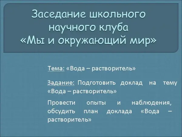 На уроке учащиеся исследуют свойство воды как растворителя; выдвигают и подтверждают с помощью опытов гипотезы о растворимости некоторых веществ в воде. Использование на уроке презентации позволяет повысить интерес учащихся к изучаемому материалу, наиболее полно решить задачи, поставленные перед уроком.