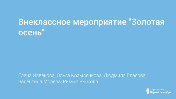 Данное внеклассное мероприятие "Золотая осень" представляет собой шоу-праздник, в котором содержится разнообразный материал об осени: стихи, песни, викторина, пословицы, сообщение о цветах, игры "Кто больше соберёт цветов", "Что в корзине?", "Варим борщ".