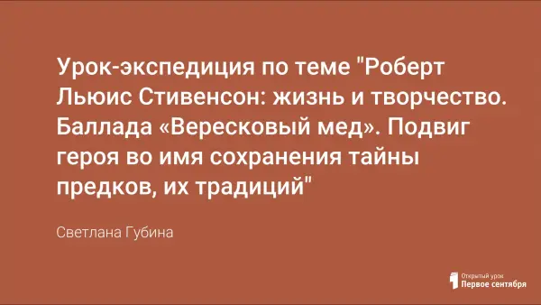 Урок литературы в 6-м классе по программе М.Б. Ладыгина. Класс снаряжает экспедицию в древнюю Шотландию. Заранее дается задание по изучению истории страны. Учитель – капитан, который ведет за собой экспедицию. Ему помогают ученики, выступающие в роли ученых-исследователей. На уроке изучается биография Р.Л. Стивенсона и его баллада «Вересковый мед».