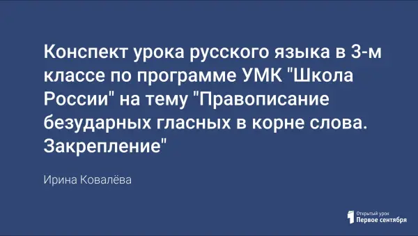 Представлен конспект урока русского языка в 3-м классе по программе УМК "Школа России" на тему "Правописание безударных гласных в корне слова. Закрепление".