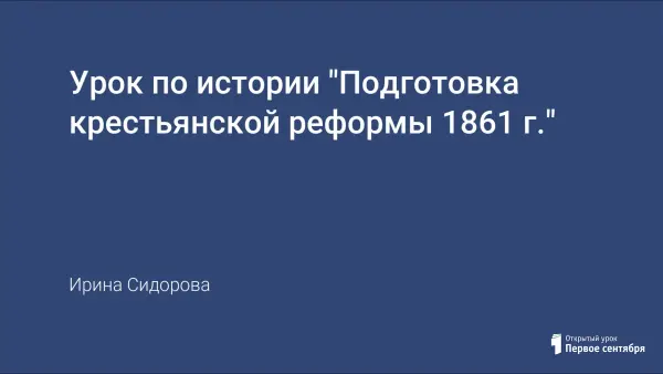 Урок "Подготовка и проведение крестьянской реформы 1861 года" в 8-м классе. Раздел: Россия во второй половине ХIХ века. Этот урок начинает новый раздел изучения истории Х1Х века. Используется комбинированный урок с элементами групповой работы. Работа с текстом документов. На уроке формируются информационно-коммуникативные навыки.