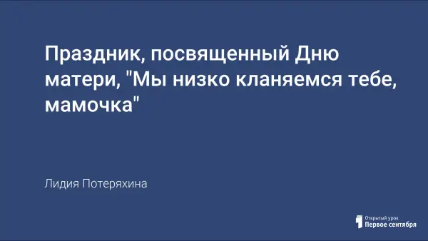 Данная работа представляет собой внеклассное мероприятие в начальной школе, посвящённое Дню матери. Направлена на совместное сотрудничество семьи и школы, а также развитие творческих способностей детей. Цель праздника: продолжить формирование уважительного отношения учащихся к семейным ценностям.