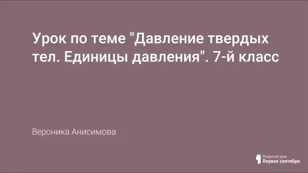 Статья включает разработку урока физики в 7-м классе и презентацию урока. Цель урока заключается во введении понятия давления, как одной из характеристик взаимодействия. Актуализация знаний на уроке осуществляется с помощью фронтального опроса. Объяснение нового материала проводится по содержанию Урока 9 Диска «УРОКИ ФИЗИКИ Кирилла и Мефодия. 7 класс» Виртуальная школа Кирилла и Мефодия. На уроке используются информационно-коммуникационная технология и технология здоровьесбережения учащихся. На уроке обеспечивается активность учащихся при использовании разных форм обучения.