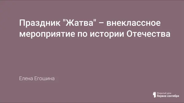 Праздник "Жатва" проводится для учащихся 6-го класса, которые начинают изучать историю Отечества. Его цель - развитие интереса детей к культуре русского народа и истории своего государства в целом. Праздник проводится в осенние месяцы. В игровой форме представлен весь год земледельца. По окончанию праздника проводится чаепитие.