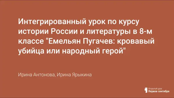 Интегрированный урок истории и литературы в 8-м классе. Тема: «ЕМЕЛЬЯН ПУГАЧЁВ: КРОВАВЫЙ УБИЙЦА ИЛИ НАРОДНЫЙ ГЕРОЙ?» Урок планирует на основе исторических фактов и литературного образа в повести «Капитанская дочка» А. С. Пушкина выяснить, кто же Пугачёв: кровавый убийца или народный герой? Задачи: познание прошлого, развитие умений видеть и оценивать смысл худ.деталей, портретных зарисовок, показ ист.обоснованности характеристики Пугачёва; подготовка учащихся к пониманию замысла создания образа.
