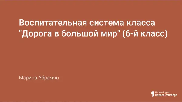 Данная воспитательная система "Дорога в большой мир" разработана в 2008 году и апробирована на учащихся 8-го и 6-го классов. Данная система создает условия для развития, формирования и раскрытия творческой индивидуальности личности каждого ребенка.