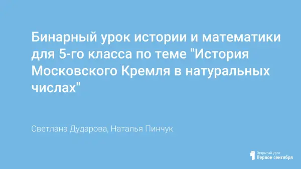 Бинарный урок истории и математики для 5-го класса по теме "История Московского Кремля в натуральных числах" определяет первоочередной целью на примере истории Московского Кремля показать ученикам взаимосвязь таких наук как история и математика. Данный урок способствует расширению кругозора учащихся, повышению интереса к отечественной истории, математике. Он может быть использован в преподавании математики в 5-м классе, а также при проведении предметных недель по истории и математике.