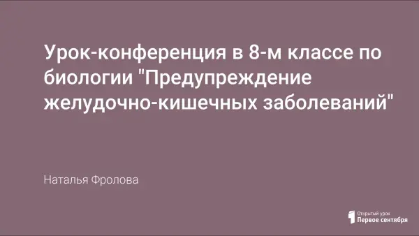 Данный урок является заключительным по теме "Пищеварение". Провожу его в виде конференции, она закрепляет и обобщает изученный материал по данной теме. Учащиеся в нетрадиционной форме общаются, расширяя знания, а тест, предлагаемый в конце урока, позволяет выяснить, не слишком ли много жира употребляют сами учащиеся.