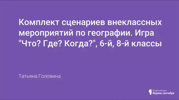 Интеллектуальная игра «Что? Где? Когда?», давно завоевавшая популярность, предназначена для внеклассной работы в 6-х и 8-х классах. Цель игры: расширение кругозора и повышение интереса к учёбе, формирование любви к Родине и бережного отношения к природе. Игры могут быть проведены на школьных вечерах, во время недели географии в школе, на семинарах по изучению опыта внеклассной работы. «Самое главное – научить людей мыслить» (Б.Брехт), поэтому вопросы игр направлены не на механическое воспроизведение в памяти той или иной информации, а на развитие творческого мышления.